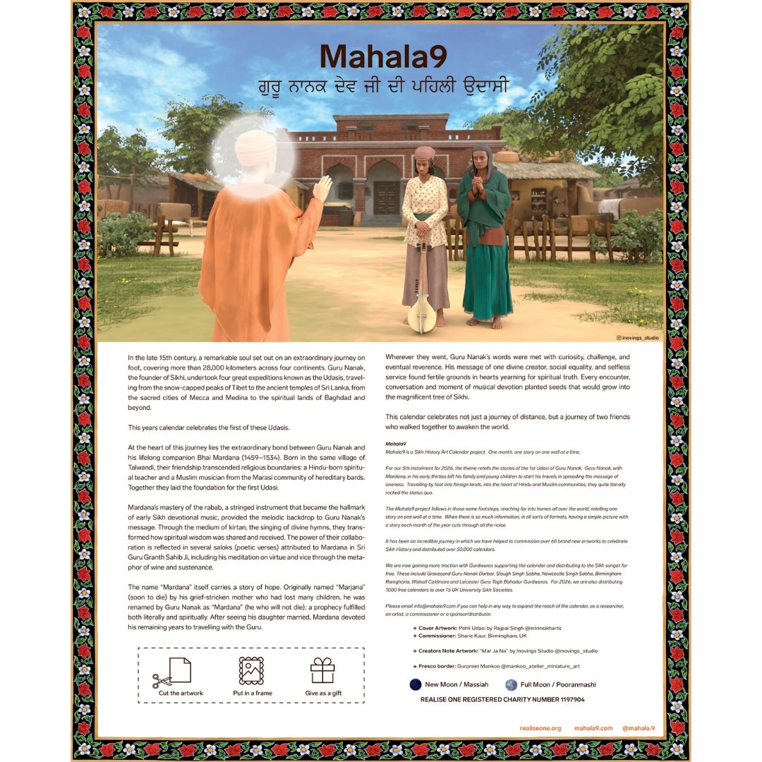 The Mahala 9 – 1st Udasi of Guru Nanak – 2026 Wall Calendar traces the beginning of Guru Nanak Dev Ji’s first Udasi, the sacred journey that followed his spiritual awakening and shaped the foundations of Sikh thought.